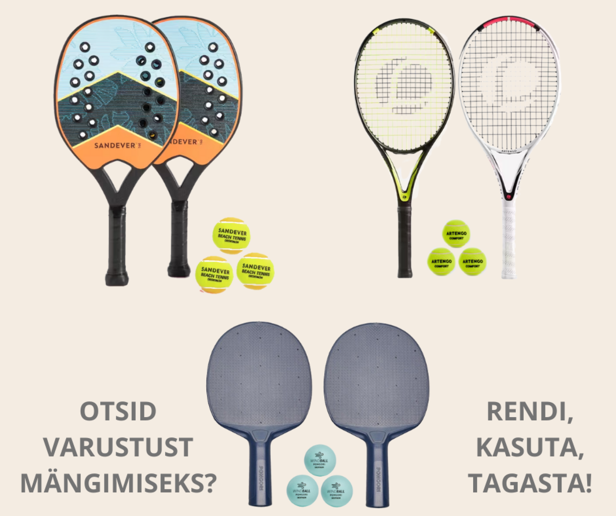 Pakume ka reketeid ja palle rendile, et saaksid sportima tulla. Rent.kvs.ee lehelt saad rentida tennise, rannatennise ja lauatennise reketite ning pallide komplekte.